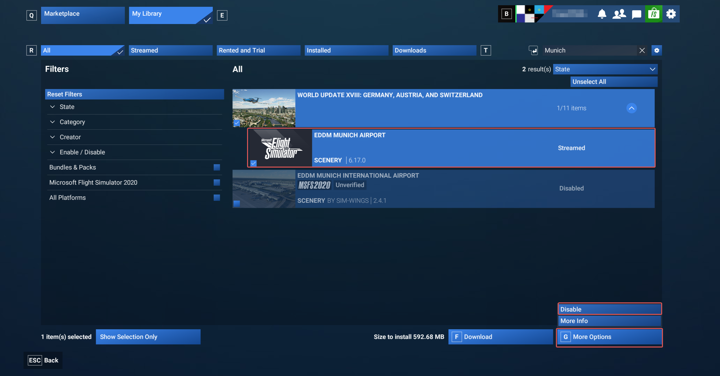 - Search for Munich in the search bar in the top right of the screen. Under the World Update XVIII: Germany, Austria, and Switzerland dropdown, select EDDM MUNICH AIRPORT, and then click the More Options button in the bottom right. Click Disable.